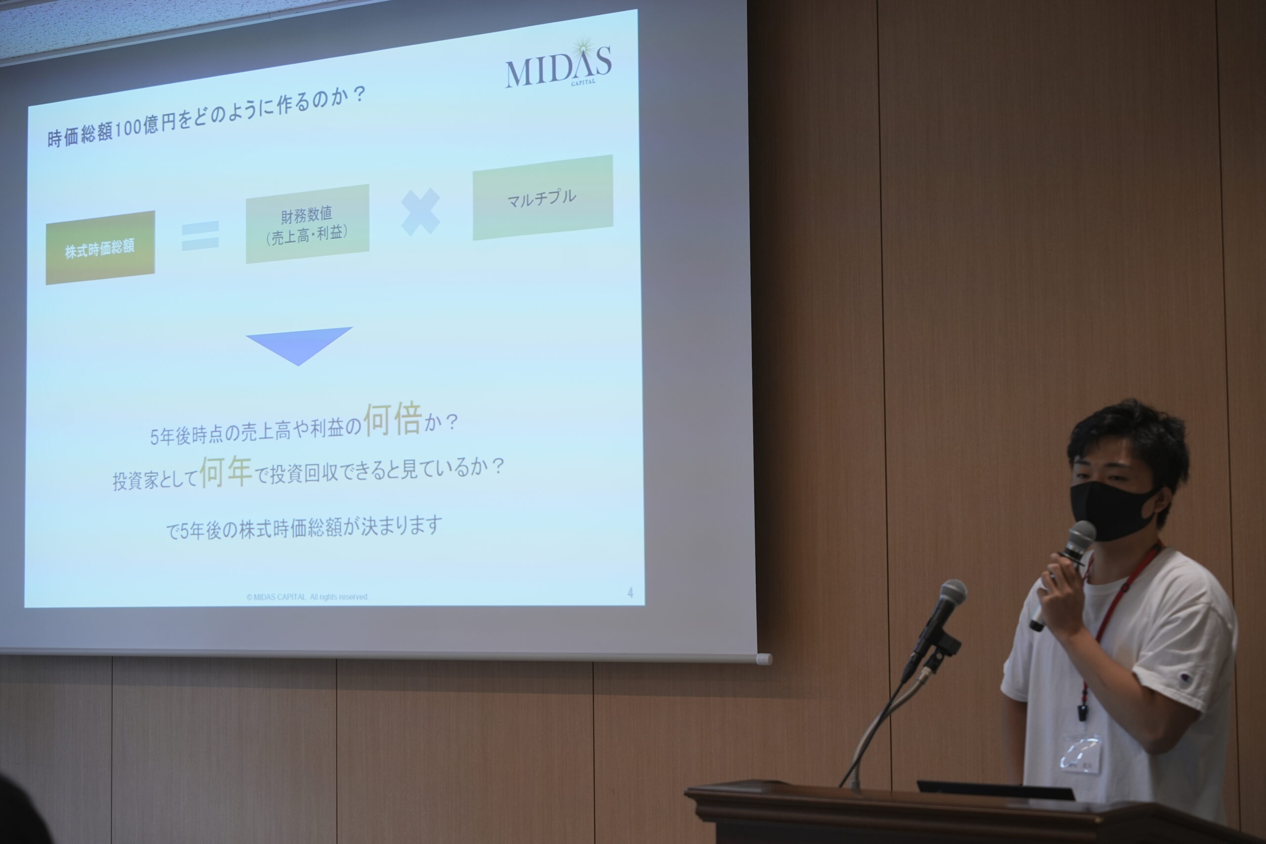 メンターとして登壇したミダスキャピタルの瀬尾真矢は、「時価総額とは何か」「マルチプルとは?」など、ビジネスの経験がない学生にも分かりやすく解説。さらに「株式時価総額100億円というのは一つの目安。みなさんには中長期的に1000億円を超えられるような事業をぜひ作ってほしい」とエールを送りました。