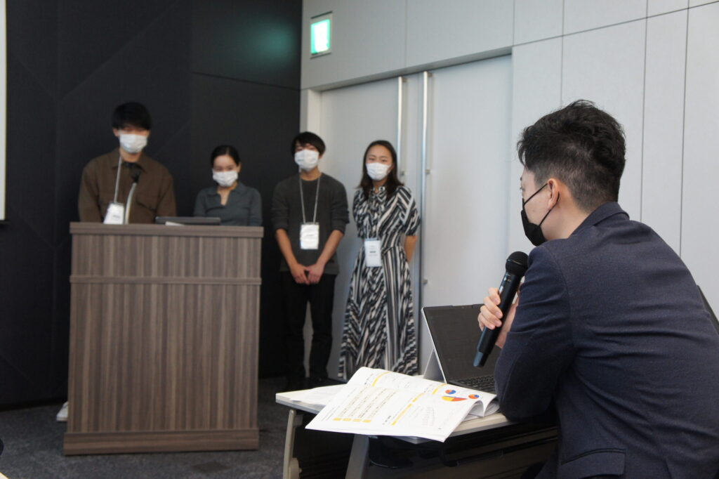 最終日の10月24日、学生たちは自分たちが考えたビジネスについて、審査員の前でプレゼンテーションを行いました。審査にあたったのは、ANGEL BRIDGE株式会社代表取締役の河西佑太郎氏、株式会社ZIZAI代表取締役CEOの塚本大地氏、ミダスキャピタル投資先である株式会社GENDA代表取締役社長の申真衣氏、ミダスキャピタル代表取締役パートナーの吉村英毅、そしてミダスキャピタル取締役パートナーの寺田修輔の5名です。