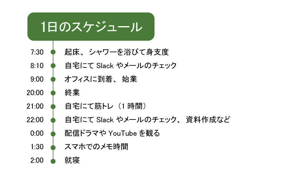 切り替えに一役買っているもう一つの存在が、エンタメ作品だ。どんなに忙しいときでも疲れているときでも、30分から1時間はドラマやアニメを見るようにしている。フィクションの世界に没頭することで、リラックスして仕事から離れる時間が取れるからだ。「2時間映画を見る時間がなかなか取れないので、最近はもっぱらドラマやお笑い芸人のYouTube。ハマれる作品に出会うと、頭も心もスッキリします」。